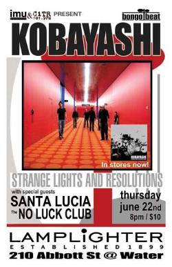 Thursday, June 22nd IMU & CiTR 101.9FM present Kobayashi, Santa Lucia, The No Luck Club + Philippe @ The LAMPLIGHTER 210 Abbott Street . Doors 8pm / $10 -:- Info: 604 681 6666