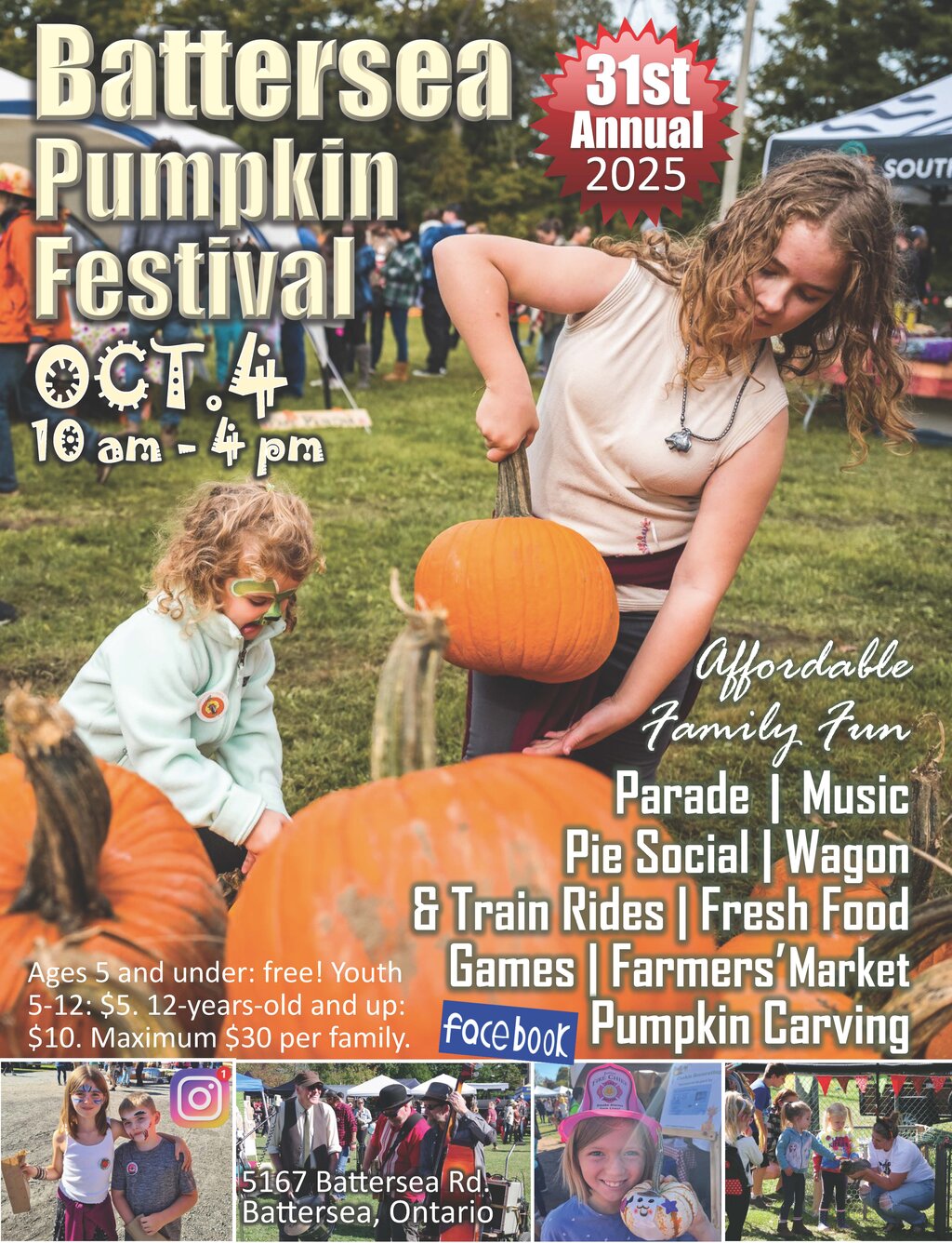 The village of Battersea, just north of Kingston, comes alive with a parade, live music, pie social, wagon and train rides, fresh food, games, farmers' market, and pumpkin carving.
