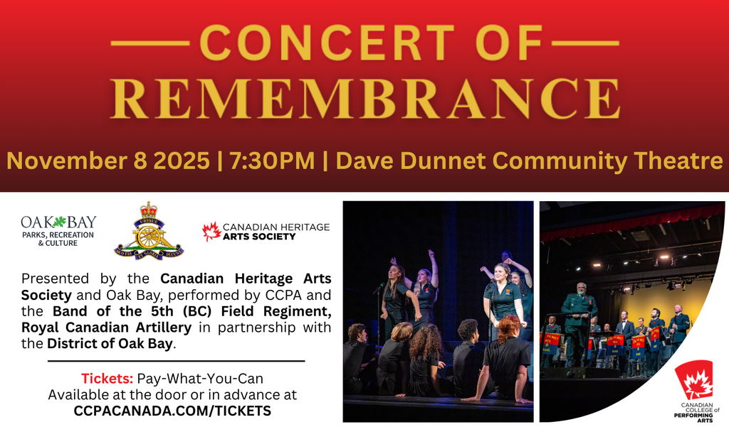 Co-presented by the District of Oak Bay for the public at the Dave Dunnet Community Theatre, with donations going to support the Canadian Heritage Arts Society and the Esquimalt Military Family Resource Centre.