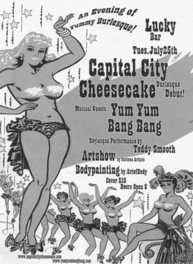A night of naughty fun! Bettina Suicide (of the BettiLu Bombshells) unveils her new Burlesque Troup, Capital City Cheesecake! Special Musical guests YumYumBangBang! Plus Boylesque by Vancouver's Teddy Smooth, body painting by Art of Body, and an exhibition of local artists! www.capitalcitycheesecake.com www.yumyumbangbang.com