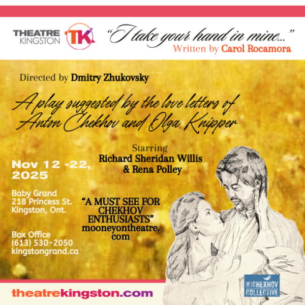 In collaboration with the Chekhov Collective, Theatre Kingston brings you I Take Your Hand In Mine by Carol Rocamora. Starring Theatre Kingston Alumni, Richard Sheridan Willis (who we loved in Boy Beatle, These Deeds and Happy Days) and the Artistic Director of the Chekhov Collective, Rena Polley.