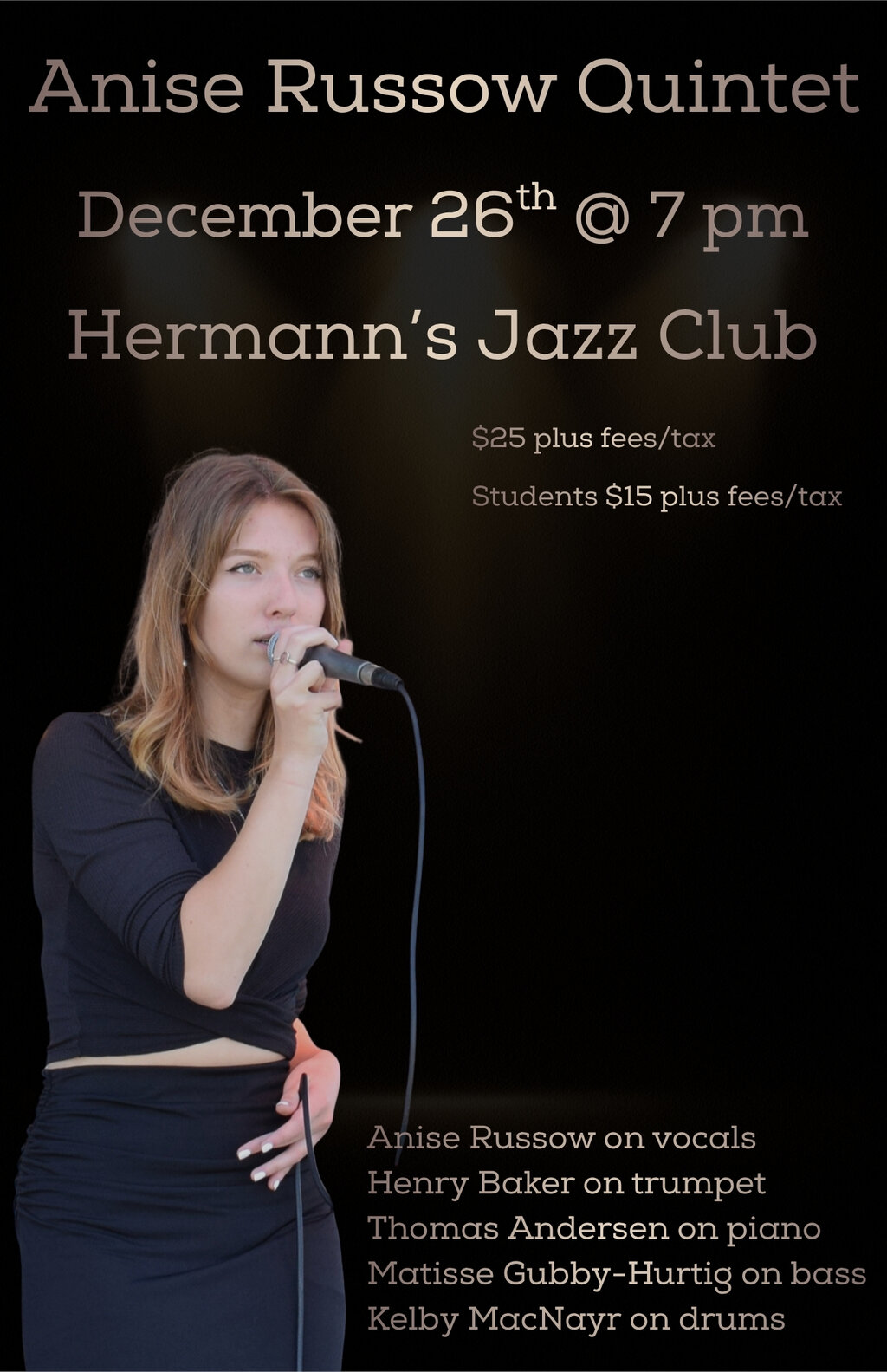 Shortly after beginning her Bachelor of Music at Humber College, Anise became a rising artist in the Toronto music scene. Her versatility has led her to notable stages across both Victoria and Toronto, including appearances at the TD Victoria International JazzFest (2019, 2023, 2025) and the Toronto Undergraduate JazzFest (2024). Featuring some of the city’s best young musicians, the Anise Russow Quintet is guaranteed to create a warm and immersive evening of music from the jazz idiom.