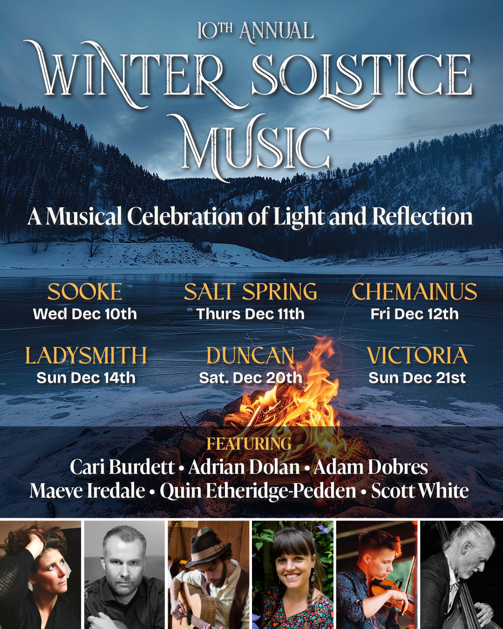 Featuring Adrian Dolan, Quin Etheridge Redden, Scott White, Adam Dobres, Cari Burdett, and Maeve Iredale, the concerts blend voices, strings, and storytelling into a moving evening of music that warms the spirit. The tour visits Sooke (Dec 10), Salt Spring (Dec 11), Chemainus (Dec 12), Ladysmith (Dec 14), Duncan (Dec 20 – matinee and evening), and Victoria (Dec 21 – matinee and evening), with both Victoria shows streaming online.