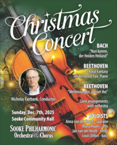 Sooke Philharmonic Orchestra & Chorus perform music of Bach, Beethoven and Holst as well as carols and an audience singalong. Sunday Dec. 7th, 2:30 PM, at Sooke Community Hall