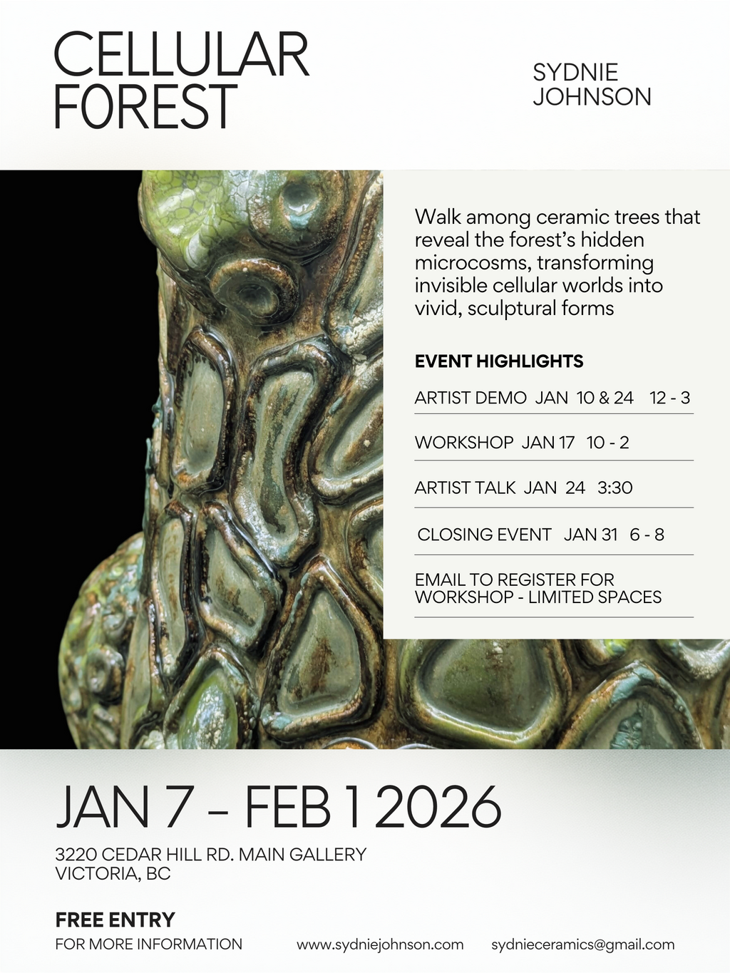 Walk among ceramic trees that reveal the forest's hidden microcosms, transforming invisible cellular worlds into vivid sculptural forms. Artist Sydnie Johnson interprets the cellular structure of West Coast plants into ceramic form.