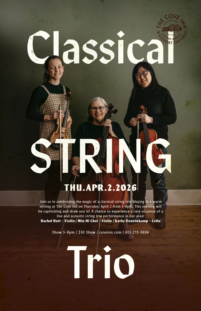 Join us in celebrating the magical return of a classical string trio playing in a warm setting at The Cove Inn on Thursday, April 2, 2026 from 5-8pm. This evening will be captivating and draw you in! A chance to experience a rare occasion of a live and acoustic string trio performance in our area! Rachel Hatt – Violin, Min-Hi Choi – Violin and Kathy Doornekamp – Cello.