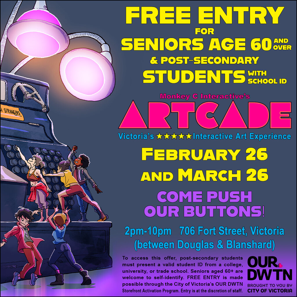 Monkey C Interactive’s Artcade is celebrating its second anniversary at 706 Fort Street by offering free entry Thursdays for seniors (ages 60+) and post-secondary students (with valid student ID), sponsored by the City of Victoria’s Storefront Activation Program. Free Senior & Student Thursdays will take place on February 26, and March 26, from 2pm–10pm.