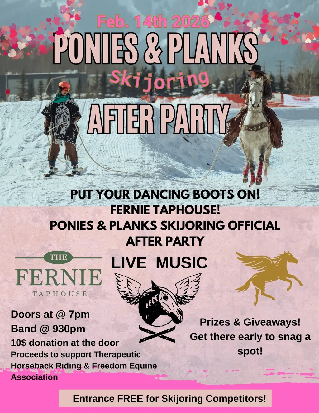Join Freedom Equine Association at Fernie Taphouse for the official Ponies & Planks Skijoring Fundraiser After Party. Keep the good times rolling after one of Fernie’s best winter days with live music, prizes, and giveaways in support of youth therapeutic riding.