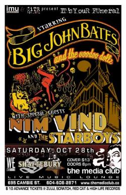 . Saturday, Oct 28th IMU & CiTR present BIG JOHN BATES & The VOODOO DOLLZ starring in "It's Your Funeral" w/ special guests NIM VIND & The STARBOYS @ The MEDIA CLUB, 695 Cambie . 8pm . $10 Advance tickets available @ Zulu, Scratch, Red Cat & online @ http://imuproductions.com/tix / $13 at the door